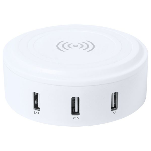 Wireless charger in plastic housing with 3 USB ports. Max output: 3100 mA. Including micro USB charger cable.