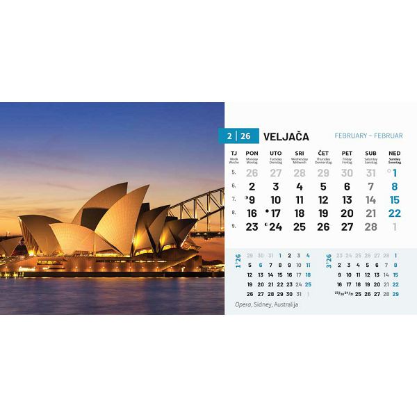 Opis proizvoda:13 listova\ndimenzija: 20,5 x 14,5 cm\nprostor za dotisak: 20 x 4 cm\nopis: tromjesecni kalendarij, koverta\ntisak: obostrani 4/4, na poledini svakog lista se nalazi kalendar za cijelu godinu\njezici: HR. GB, DE\nvrsta papira: KD 135 g/m2 listovi, HIGH POINT 295 g /m2 podloga \nuvez: spiralni\npakiranje: 1 kom