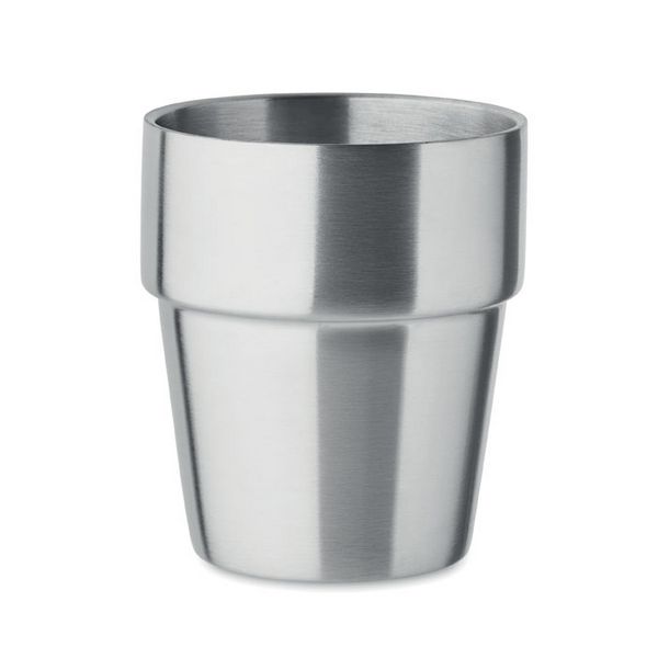 Dvoslojna čaša od recikliranog nehrđajućeg čelika (90% recikliranog nehrđajućeg čelika i 10% nehrđajućeg čelika). Može se slagati. Kapacitet: 250 ml.