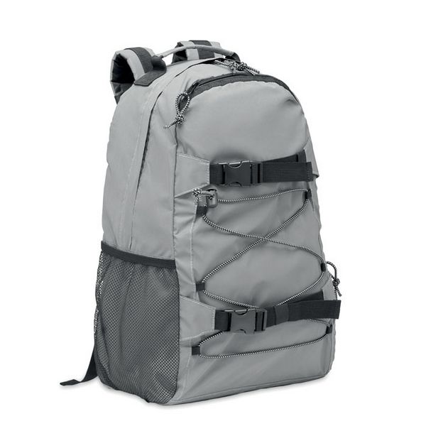 Ruksak od visoko reflektirajućeg 190T poliestera s uzicom sprijeda. Podstavljena leđa, naramenice i dno. Ima pretinac za laptop od 15 inča. Jedan bočni mrežasti džep i drugi bočni džep s patentnim zatvaračem.
