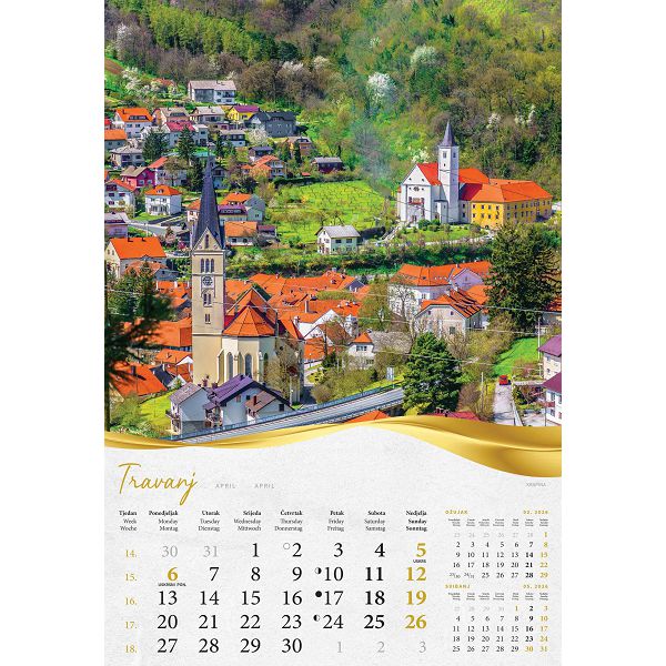 Opis proizvoda:13 listova\ndimenzija: 33 x 55 cm\nprostor za dotisak: 33 x 7 cm\nopis: tromjesecni kalendarij,vrecica\njezici: HR, GB, DE\nvrsta papira: KD 150 g/m2 listovi, 350 g/m2 podloga\nuvez: spiralni\npakiranje: 40 kom