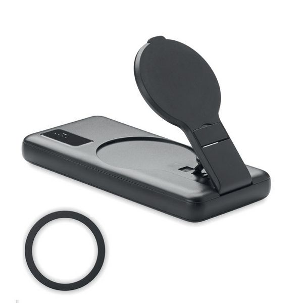 Magnetski bežični punjač (15 W), power bank (10000 mAh) od ABS-a i funkcija magnetskog stalka za telefon. Ulaz: micro B, Type-C. Izlaz 2x USB-A ulaz/Type-C/DC 9V/1,66A (15 W) idealno za brzo punjenje. Uključuje dodatni magnetski metalni prsten za potporu.