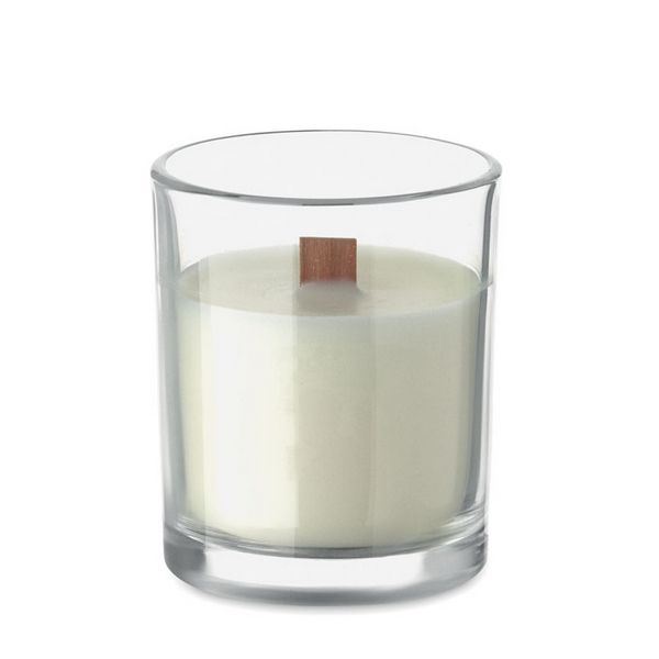 Voštana svijeća s mirisom vanilije, 80 g, u staklenoj posudi s drvenim fitiljem. Vrijeme gorenja 14 sati.