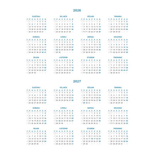 dimenzija: ~ A4 / 20 x 26,5 cm \nOpis proizvoda:192 stranice\njezici: HR\nvrsta papira: 80 g/m2 listovi\ntisak: dvije boje\nuvez: šivano, kapital vrpca, pokazna vrpca\npreporucena vrsta tiska: sitotisak, foliotisak, UV tisak\nSadržaj\nPrvi dio sadrži osnovne podatke, kalendarij za 4\ngodine, godišnji planer po mjesecima, vremenske zone,\nmedusobne udaljenosi izmedu glavnih gradova europskih\ndržava, metricke mjere. Drugi dio sadrži bilješke.